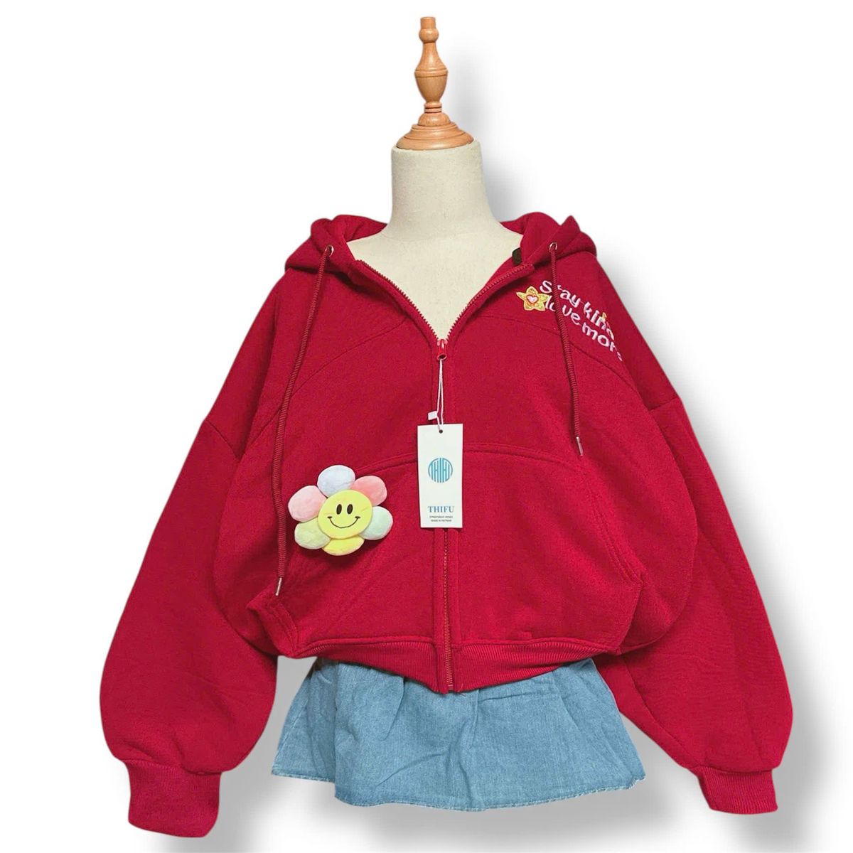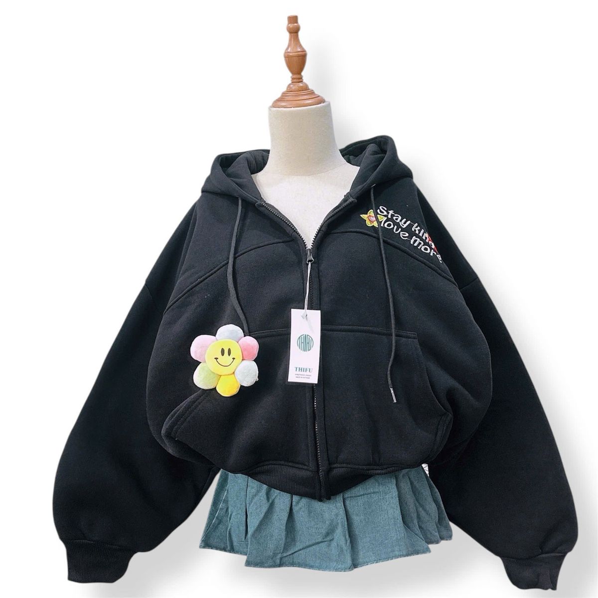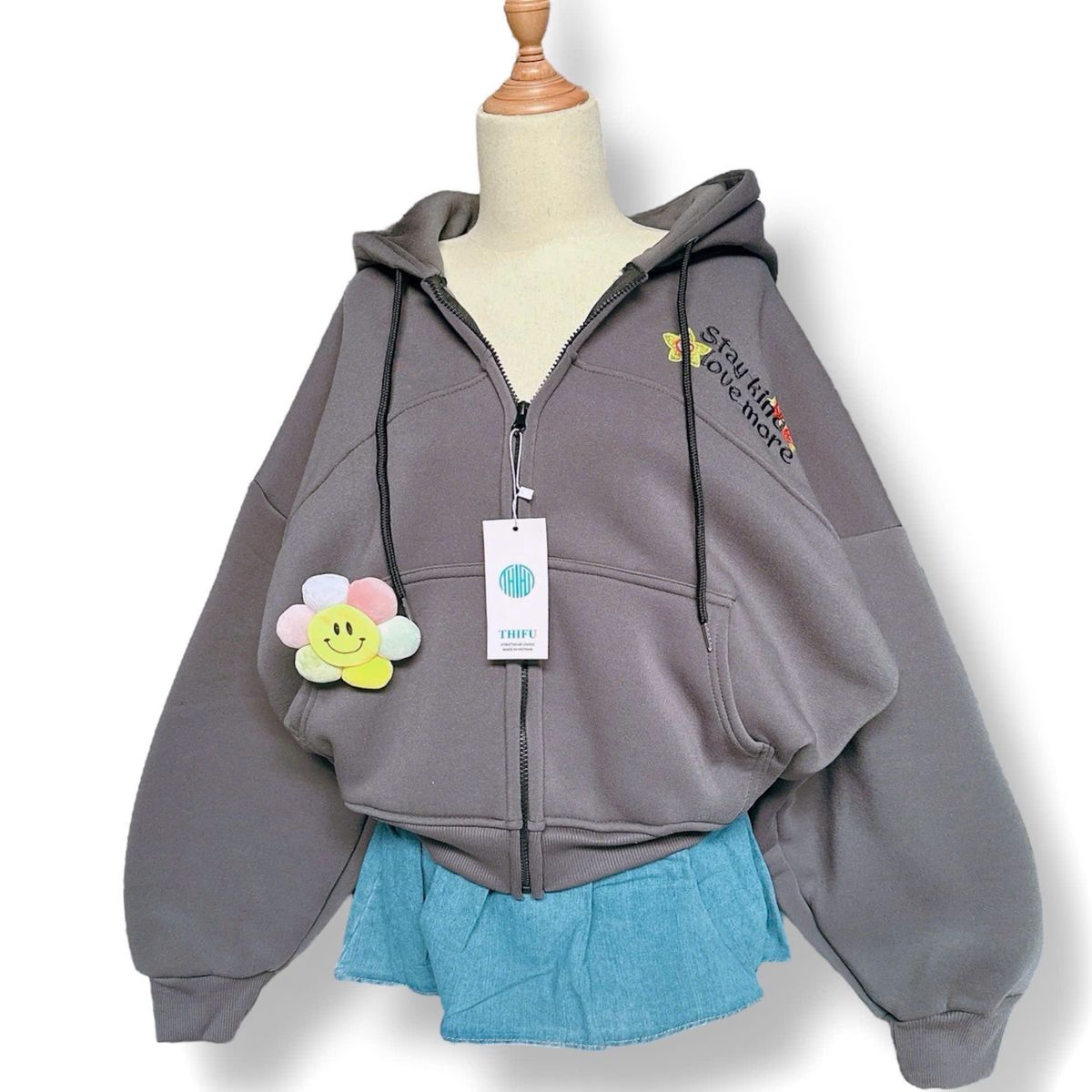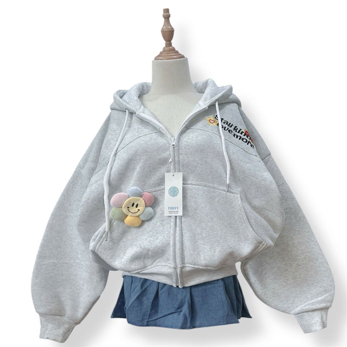 Áo khoác nỉ dành cho nữ dây kéo phao, logo thêu STAYKIND LOVE MORE
