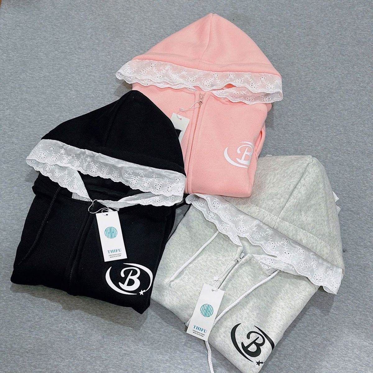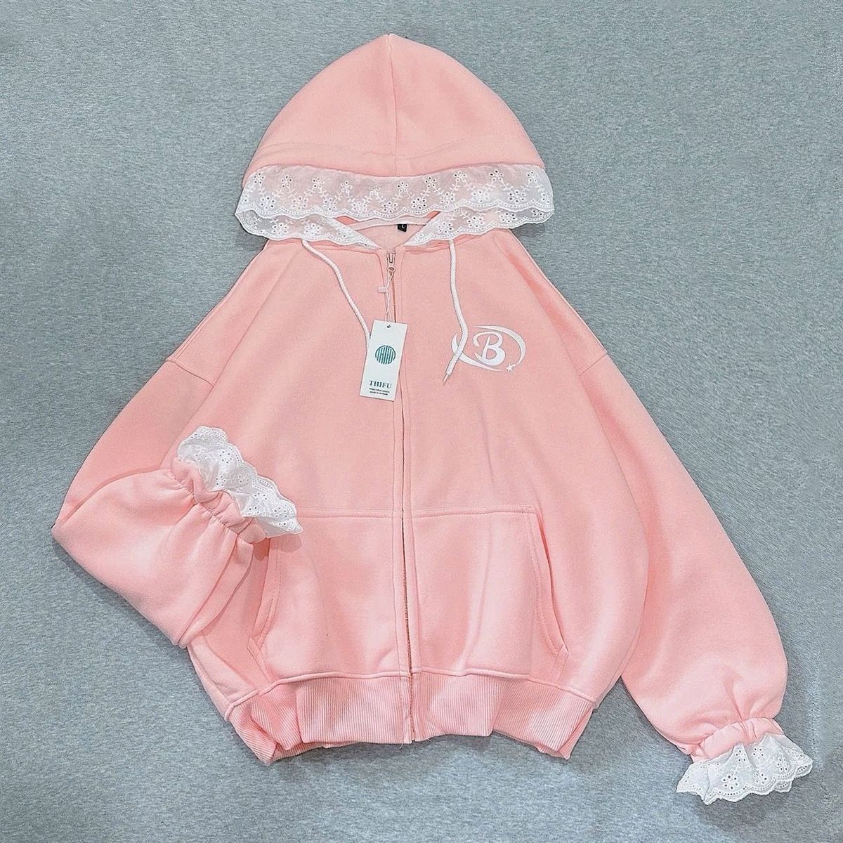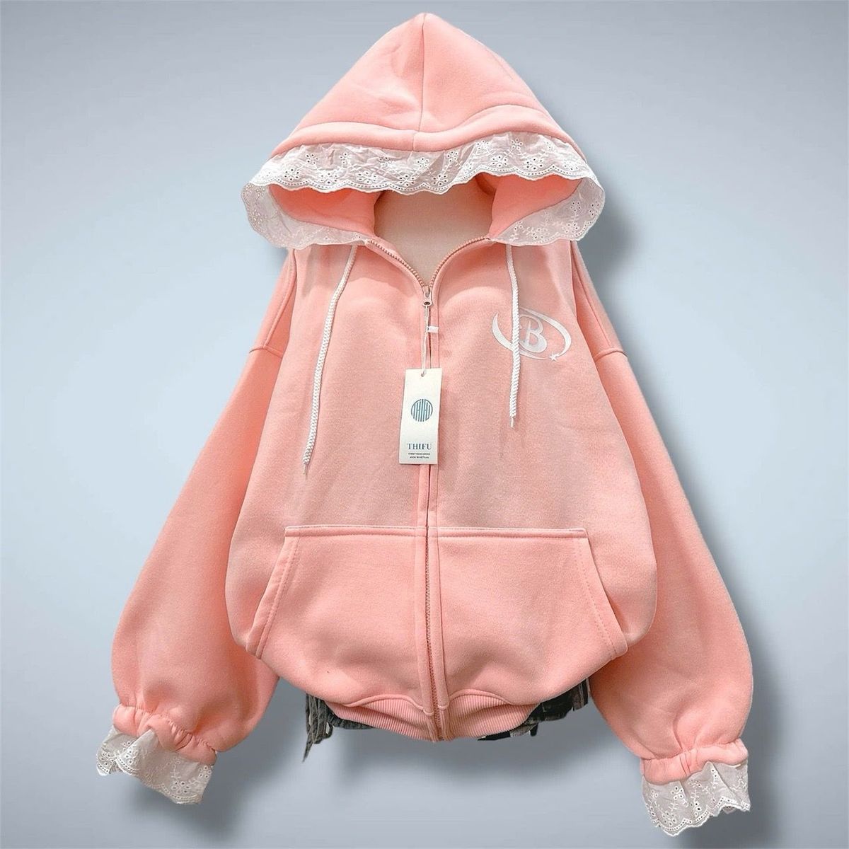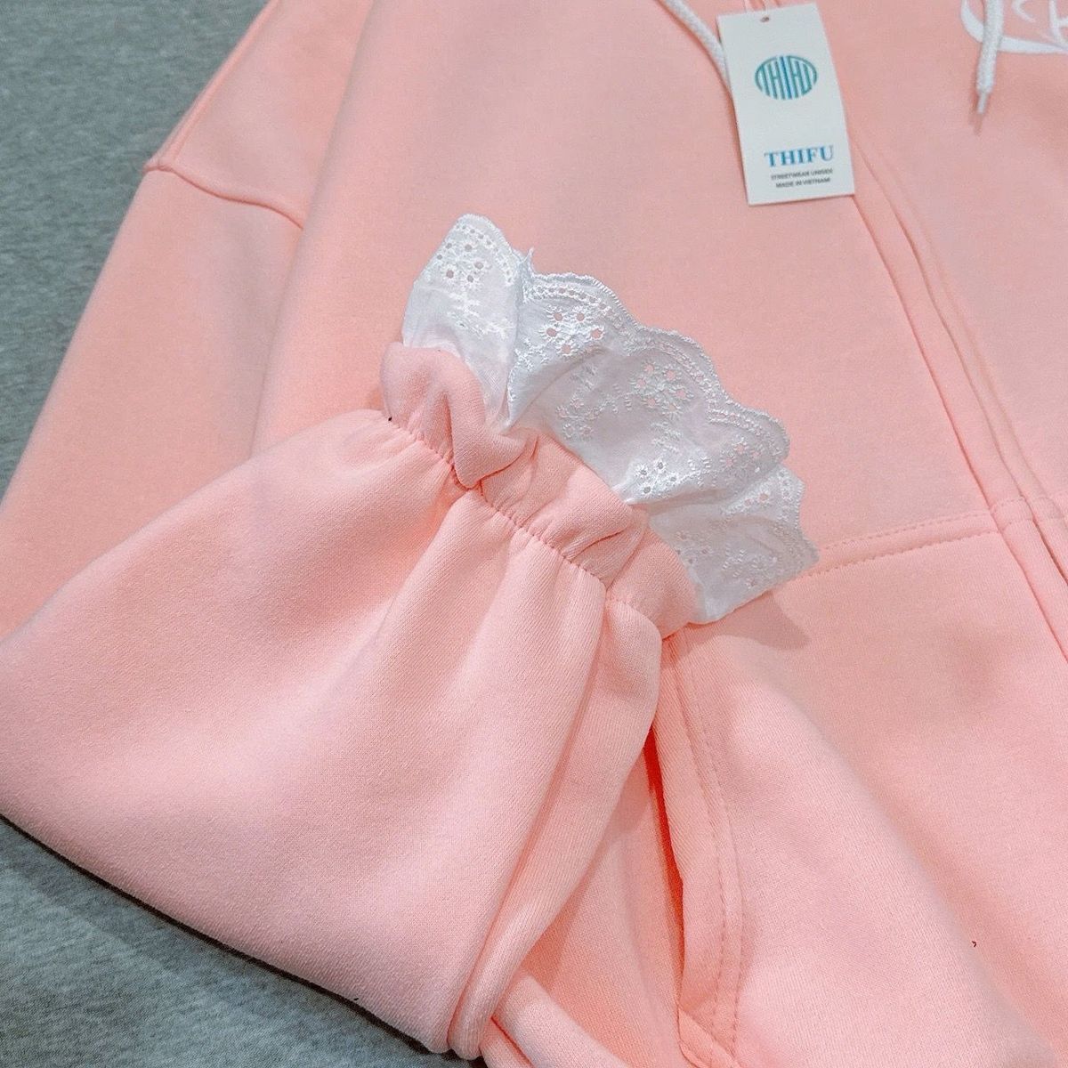 Áo khoác nữ chất nỉ bông mũ phối ren