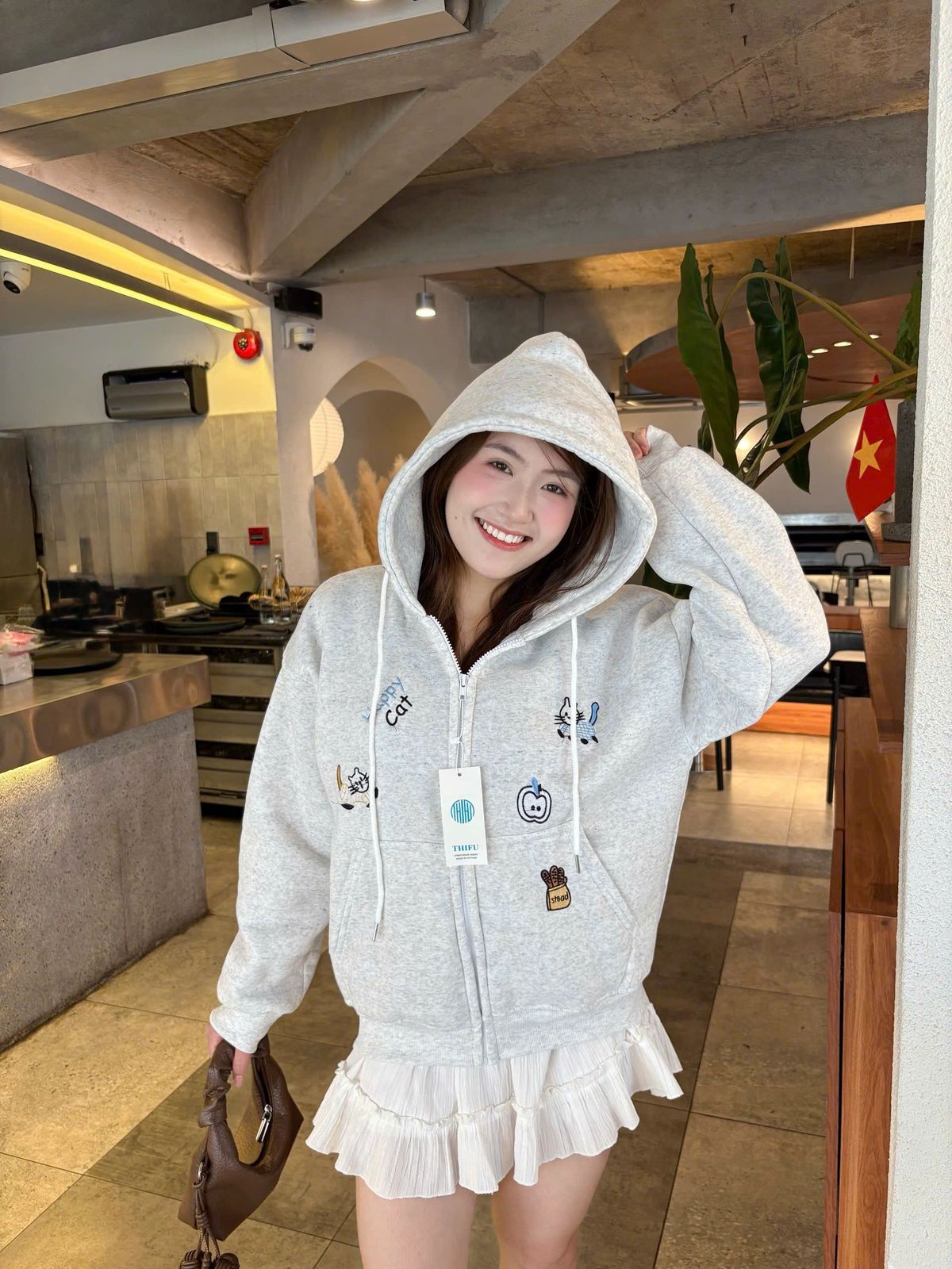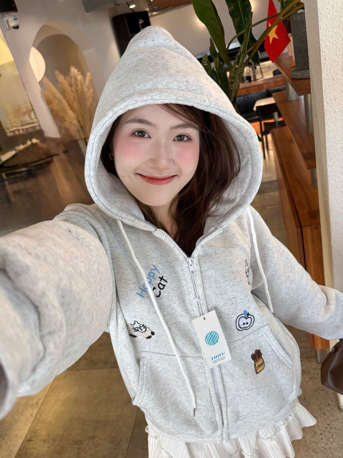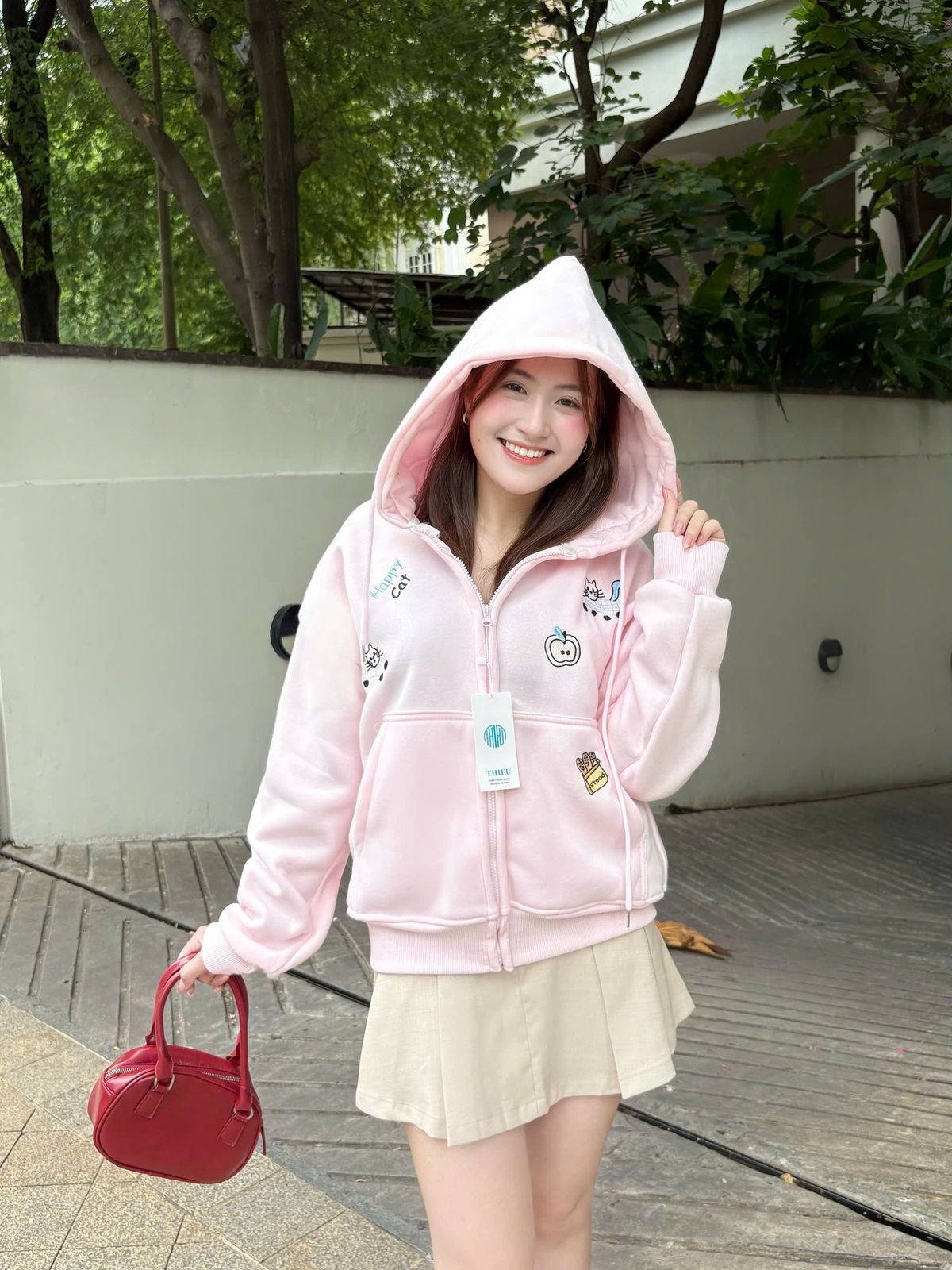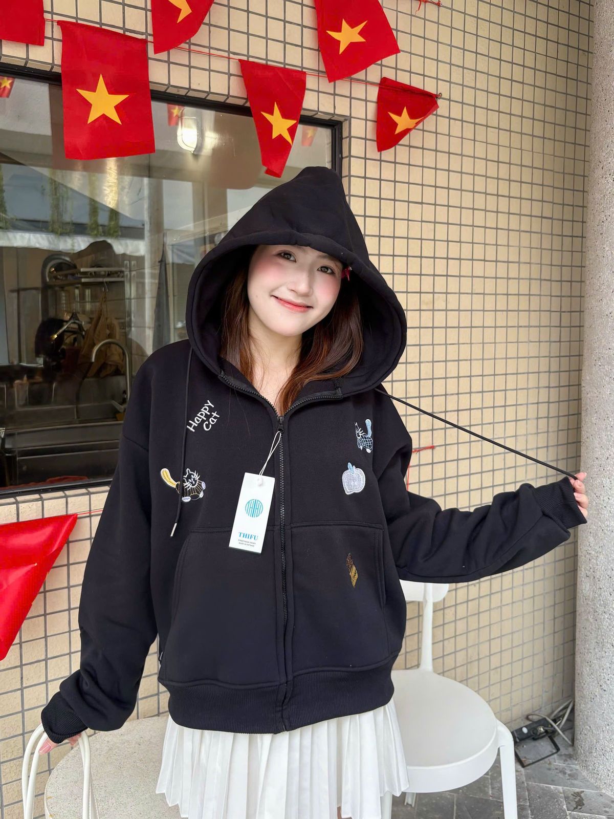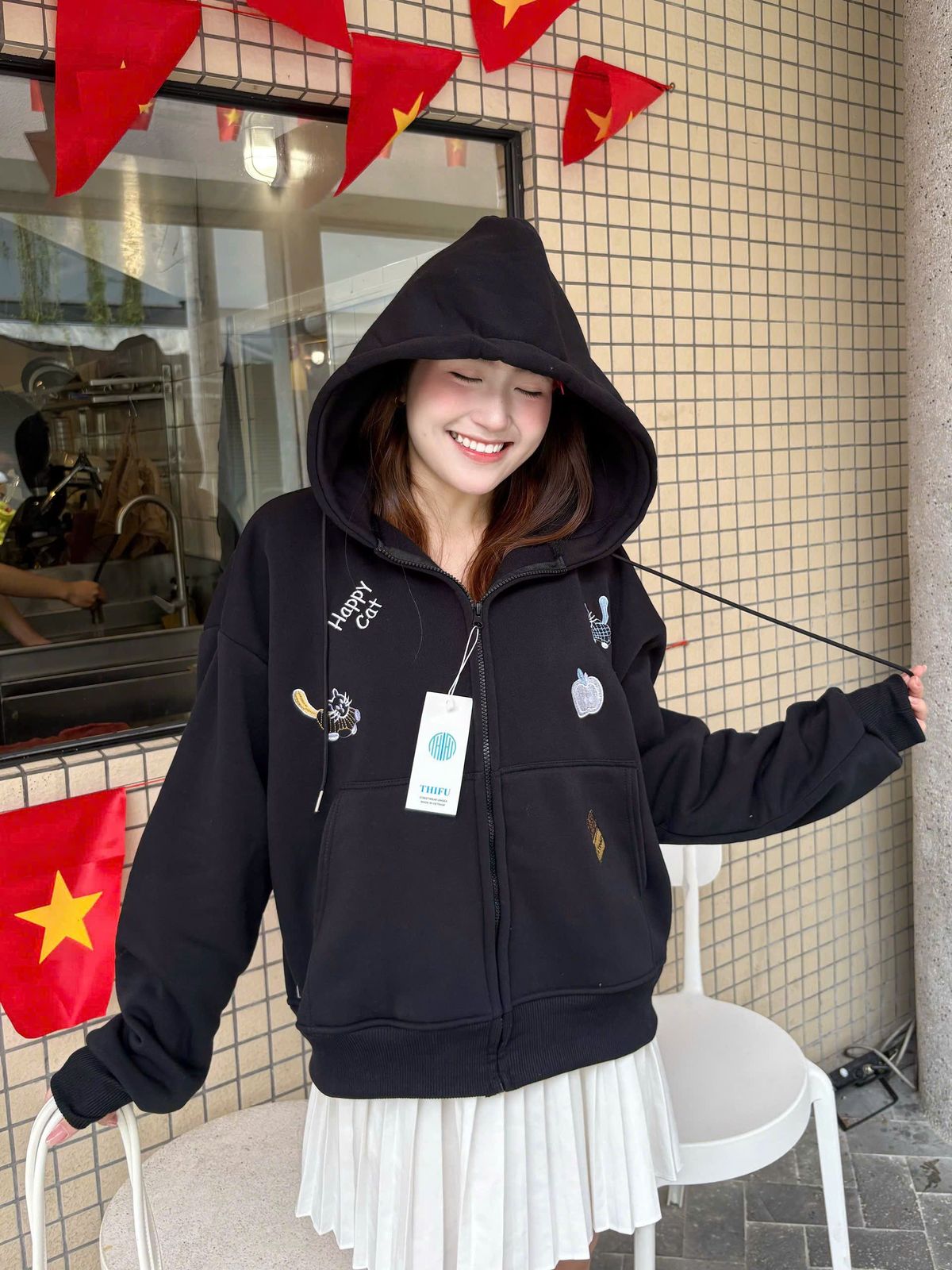 áo khoác HAPPY CAT mới về. nón 2 lớp vải chính.logo thêu . nỉ dệt xuất khẩu dày mịn .form 65kg. hàng đẹp bán shop. Dáng thường.có túi trong.bo thun.