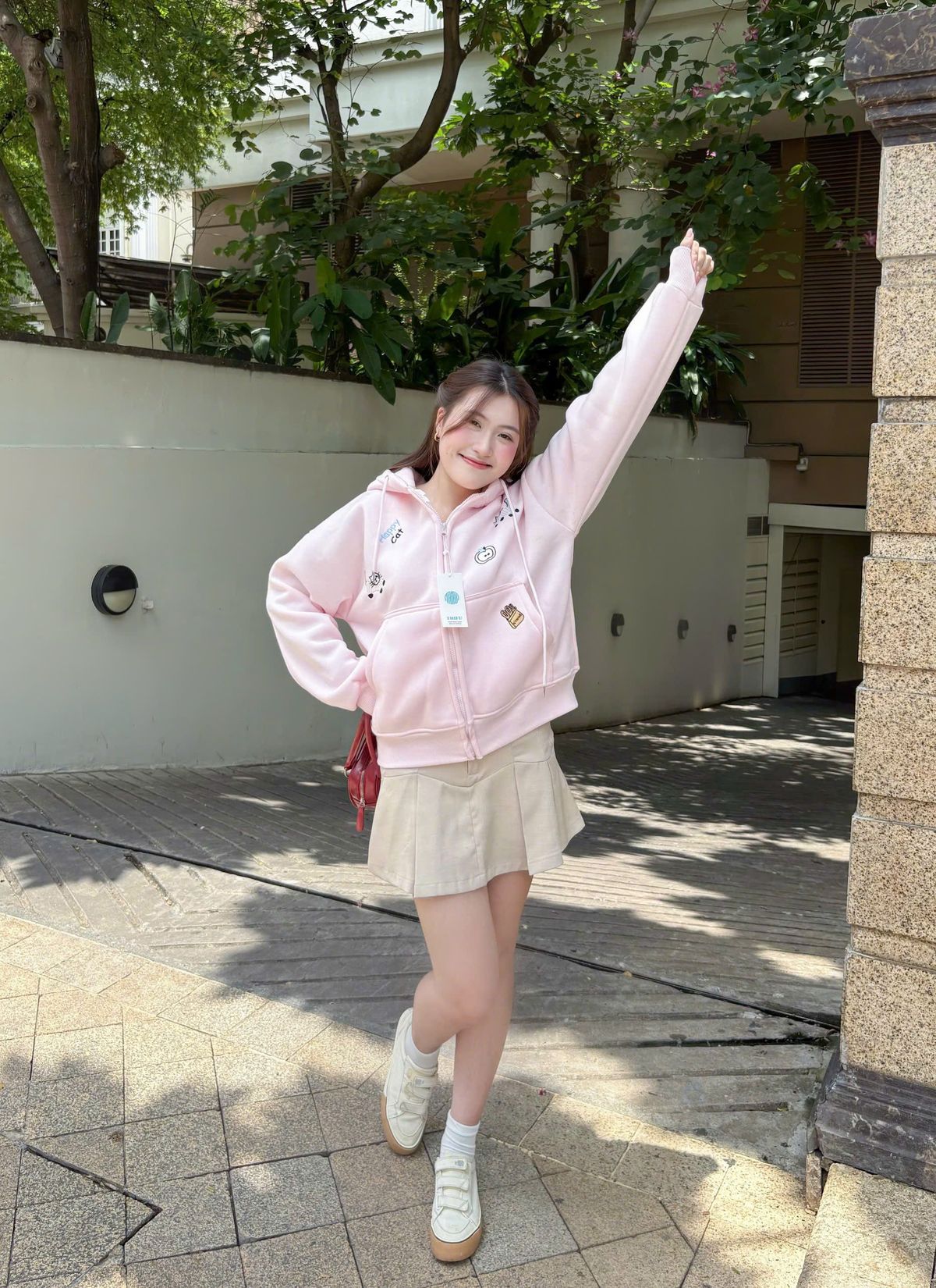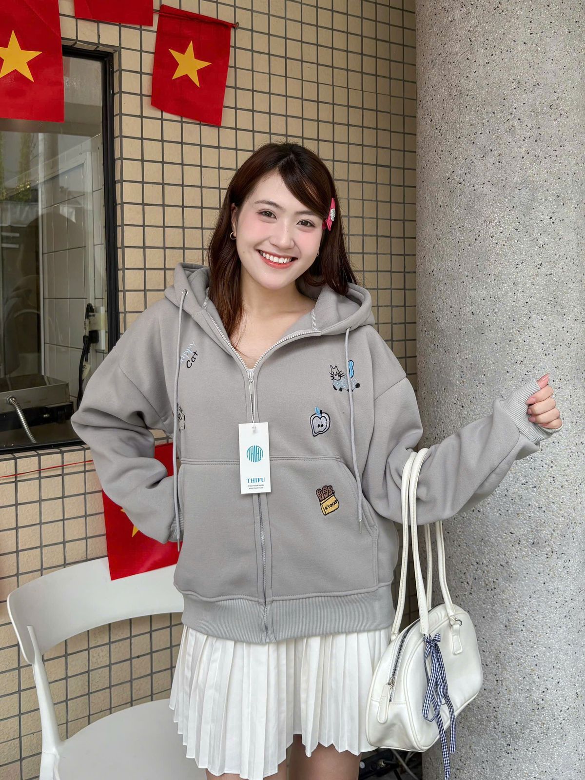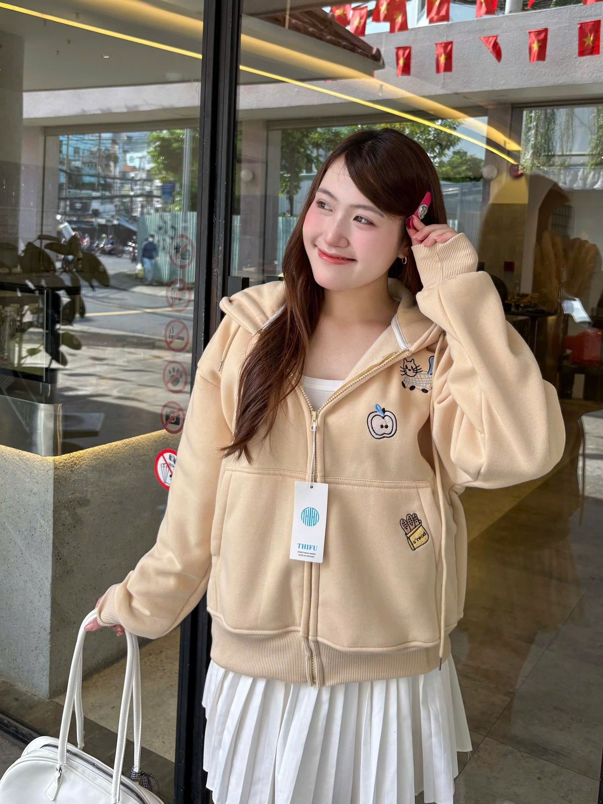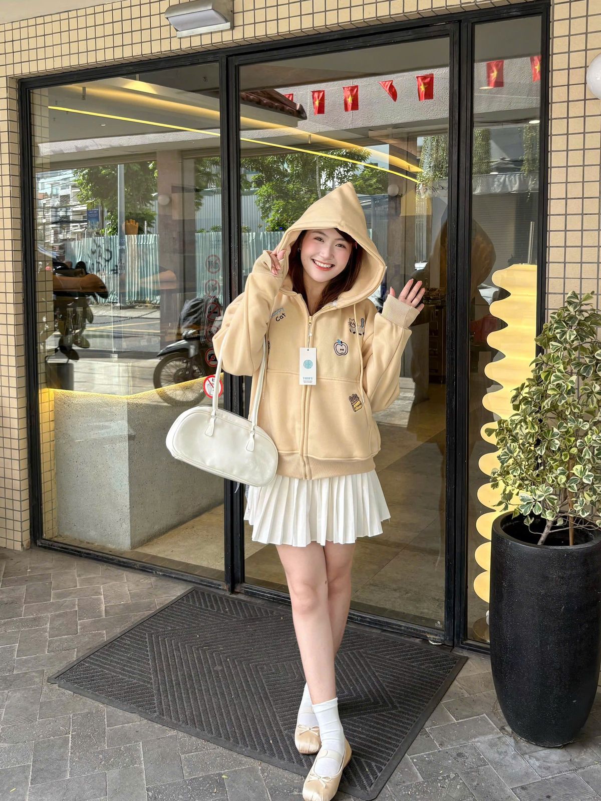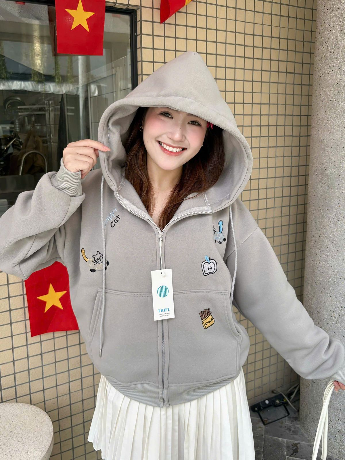 áo khoác HAPPY CAT mới về. nón 2 lớp vải chính.logo thêu . nỉ dệt xuất khẩu dày mịn .form 65kg. hàng đẹp bán shop. Dáng thường.có túi trong.bo thun.