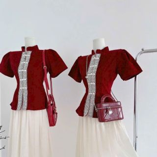 Set áo tay lỡ đính nơ bèo, chân váy sọc xanh trắng