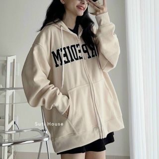 Áo khoác dây kéo phao logo thêu form dài rộng nón 2 nón dây nón có tép da
